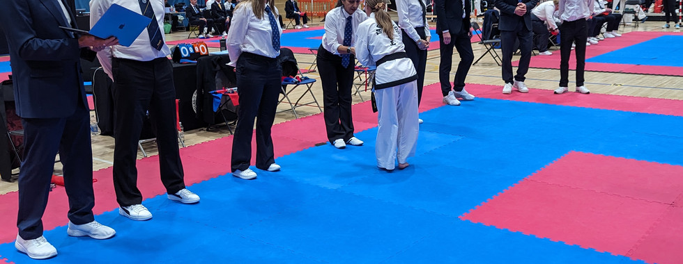 Edie, being away at University, was competing for Cambridge TKD and she did very well in patterns and sparring. Her patterns could do with some tidy up and improved accuracy but she has a good natural approach to how patterns are performed. She came 2nd in the Adult Female Blackbelt 1st Degree patterns with some very good performances and only lost to a woman from a very competitive school. With a bit more focussed practice she really could do well. Her sparring was a straight final because being so light (45kg?) there are not many adult females to compete against. She won the first round but then again, same as all Banstead fighters, her lack of fitness let her down and the match swayed in the opponents favour. She did great and felt good about her performance and realised was needs improvement.